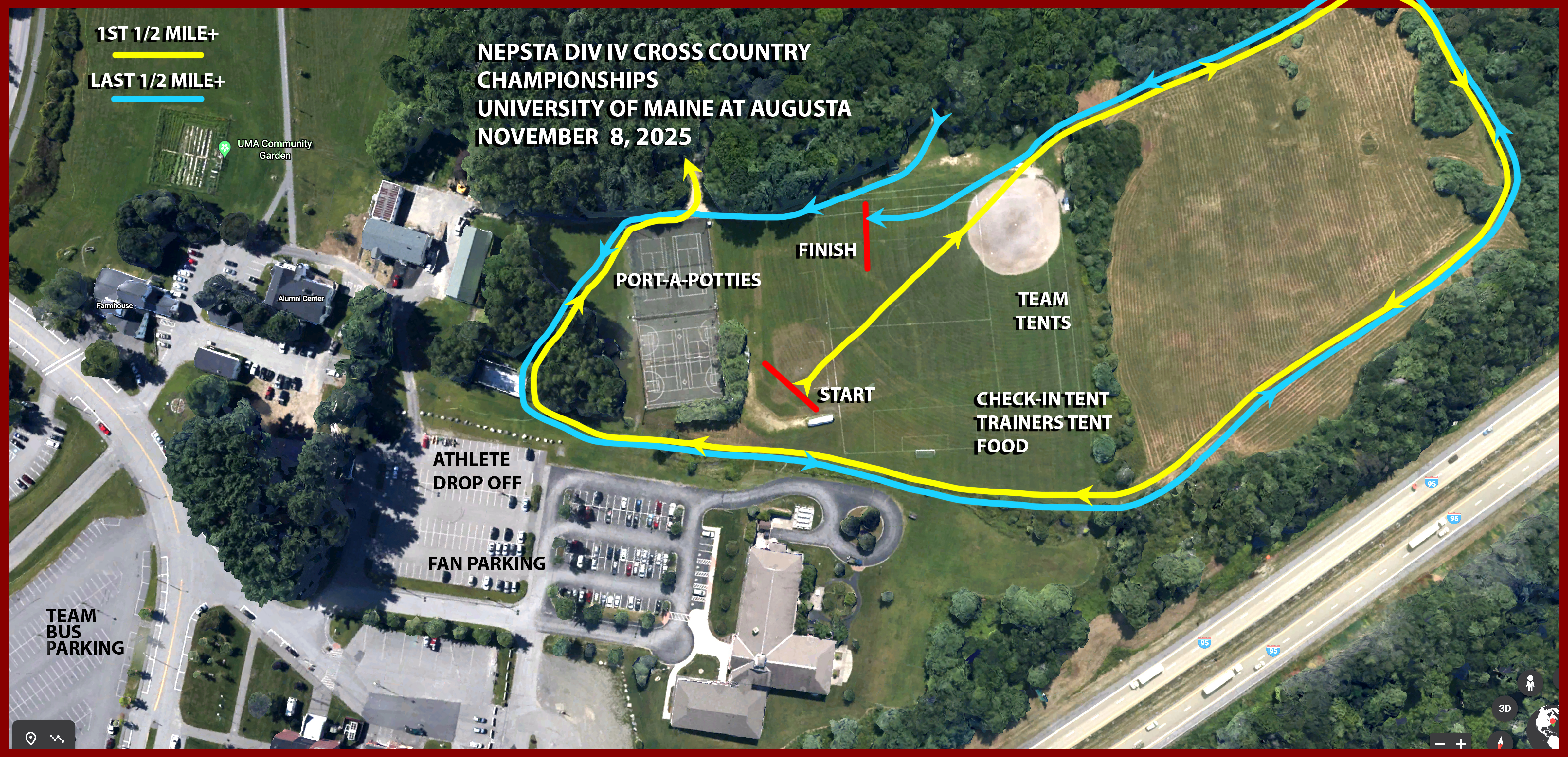 NEPSTA Division IV Cross Country Championships 2025 Race Details Event Date 11/08/25 Race start time(s) 1:30 Girls Varsity, 2:15 Boys Varsity, 3:00 Boys sub-varsity Event Location University of Maine at Augusta Baseball Field Event Address 60 Community Drive Event City Augusta Event State ME Race ID 422 Event Information Course Map Course map Website USATF Cert. No. N/A Directions Look at the course map to help you find exactly where to go Results Live Results link https://www.iresultslive.com/results/?eid=6624 Older Results GSRS Results Archive Recent Results 20252024202120192018201720162015 Race comments Races not held in 2020 no