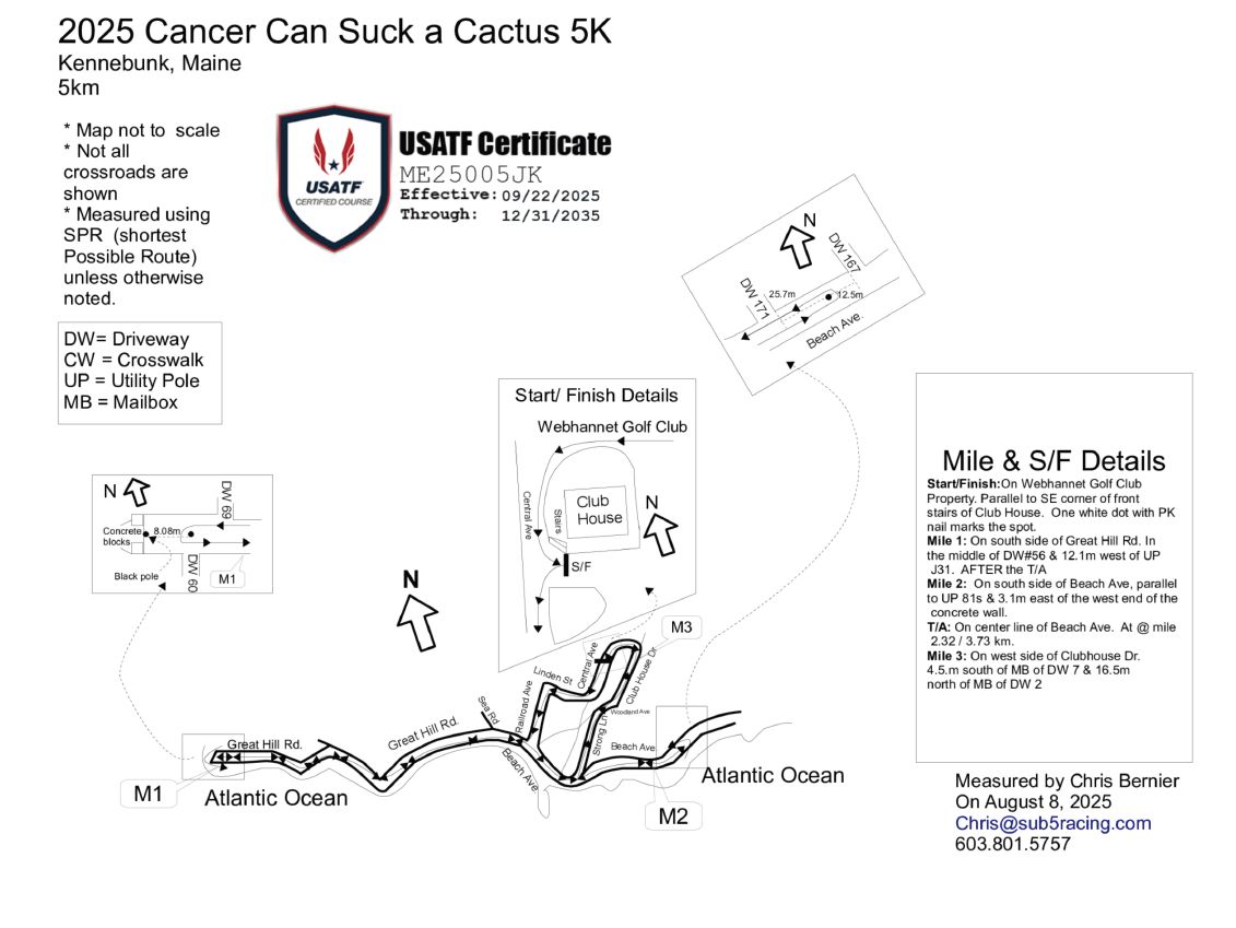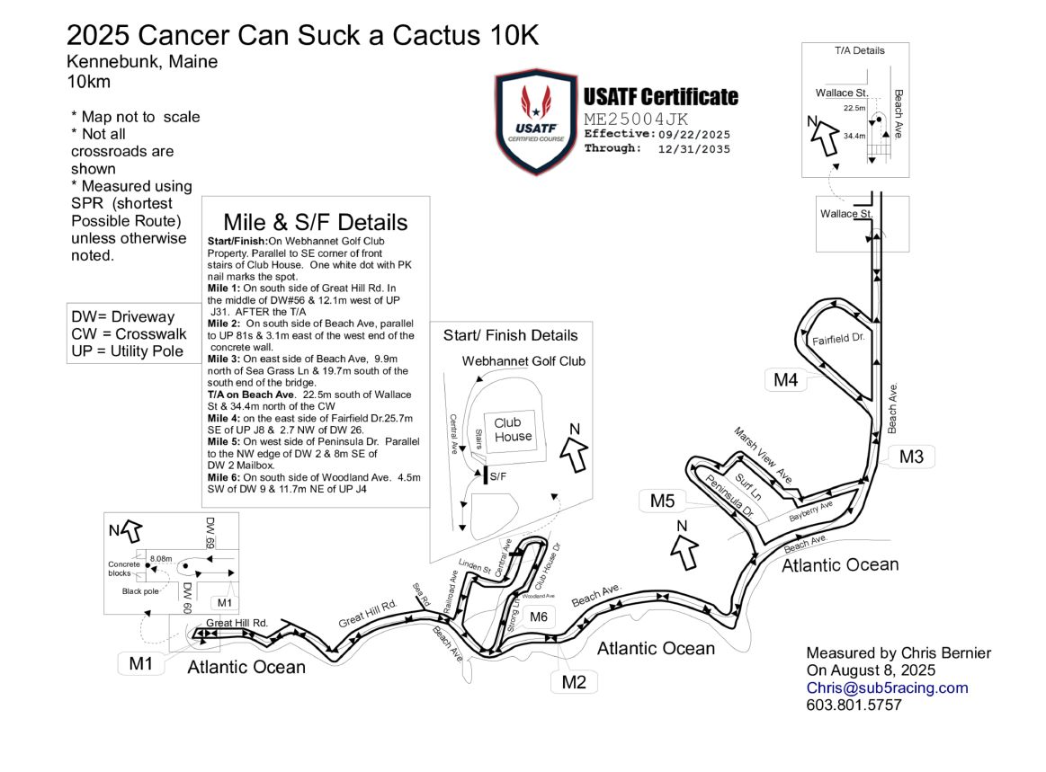 Cancer Can Suck a Cactus 5k/10k 2025 Race Details Event Date 11/02/25 Race start time(s) Fun Run 10:45 AM; 5k/10k 11:00 AM Event Location Webhannet Golf Club Event Address 26 Golf Club Drive Event City Kennebunk Event State ME Race ID 1095 Event Information Registration URL https://runsignup.com/Race/ME/Kennebunk/CancerCanSuckACactus Course Map 5k Course Certification Map 10k Course Certification Map USATF Cert. No. Pending Results Live Results link https://www.iresultslive.com/results/?eid=6614 Older Results Recent Results 2025 no